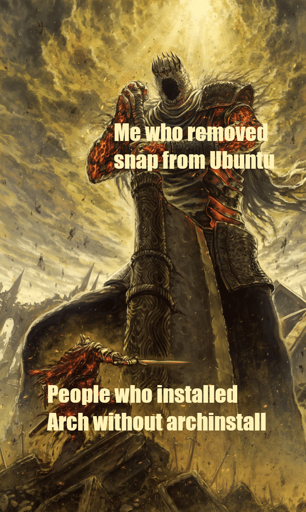 Me who doesn’t completely care what flavor of Linux is installed and uses flatpaks and docker for everything because I just want things to work and threw away my integrity after my first catastrophic hardware failure of my server that I’d been maintaining poorly and precariously on an external drive for three years.