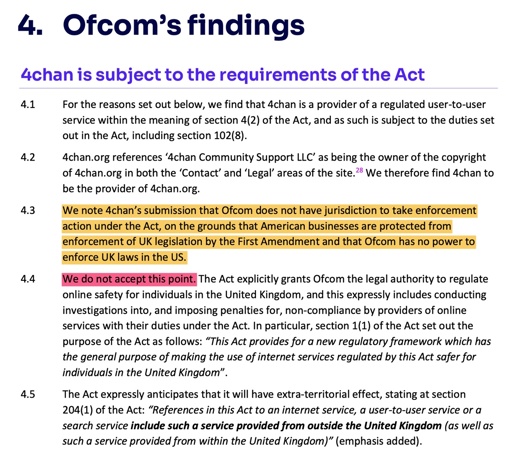 I think we’re on the same page. Ofcom can’t force 4chan to do anything, because they don’t have jurisdiction over 4chan. They can’t force 4chan to implement age verification, or to implement geoblocks. They can issue fines if they feel like it, but they’re uncollectible.