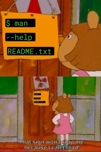 $ command -h Invalid argument Usage: command [subcommand] Available Subcommands: help version build etcThat sign won’t stop me, because I can’t read!