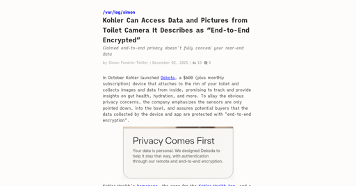 arrow-up1143arrow-down1external-linkKohler Can Access Data and Pictures from Toilet Camera It Describes as “End-to-End Encrypted”varlogsimon.leaflet.pubJensSpahnpasta@feddit.org to Technology@lemmy.worldEnglish · 9 days agomessage-square43fedilink