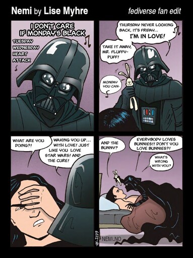 - Another problem is that the strips are often wordier than they need to be. Maybe it’s a European thing, like Tintin used to be. Anyway, there’s no need for Darth Nemi to be reciting the whole first stanza in panel 1, she can break it up into two halves so that the stanza ends in panel 2 with “I’m in Love” which has a lot better comedic timing imho. Plus that way the bunny gets to say “Monday you can–” which suggests all kinds of possibilities, like “Monday you can… shove it up your exhaust vent!?” The excessive wordiness is definitely something the editor oughta be telling.