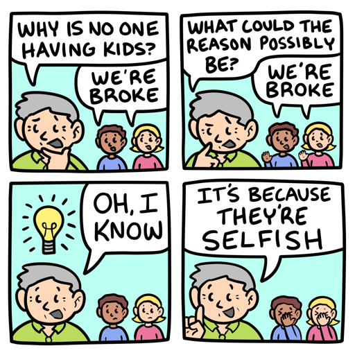 Where I live, it’s a thousand dollars a month to rent A ROOM. The not particularly nice one bedroom apartments closest to where I live are 1700 a month. Food has never been more expensive. How people supposed to afford kids which are notoriously expensive to have?